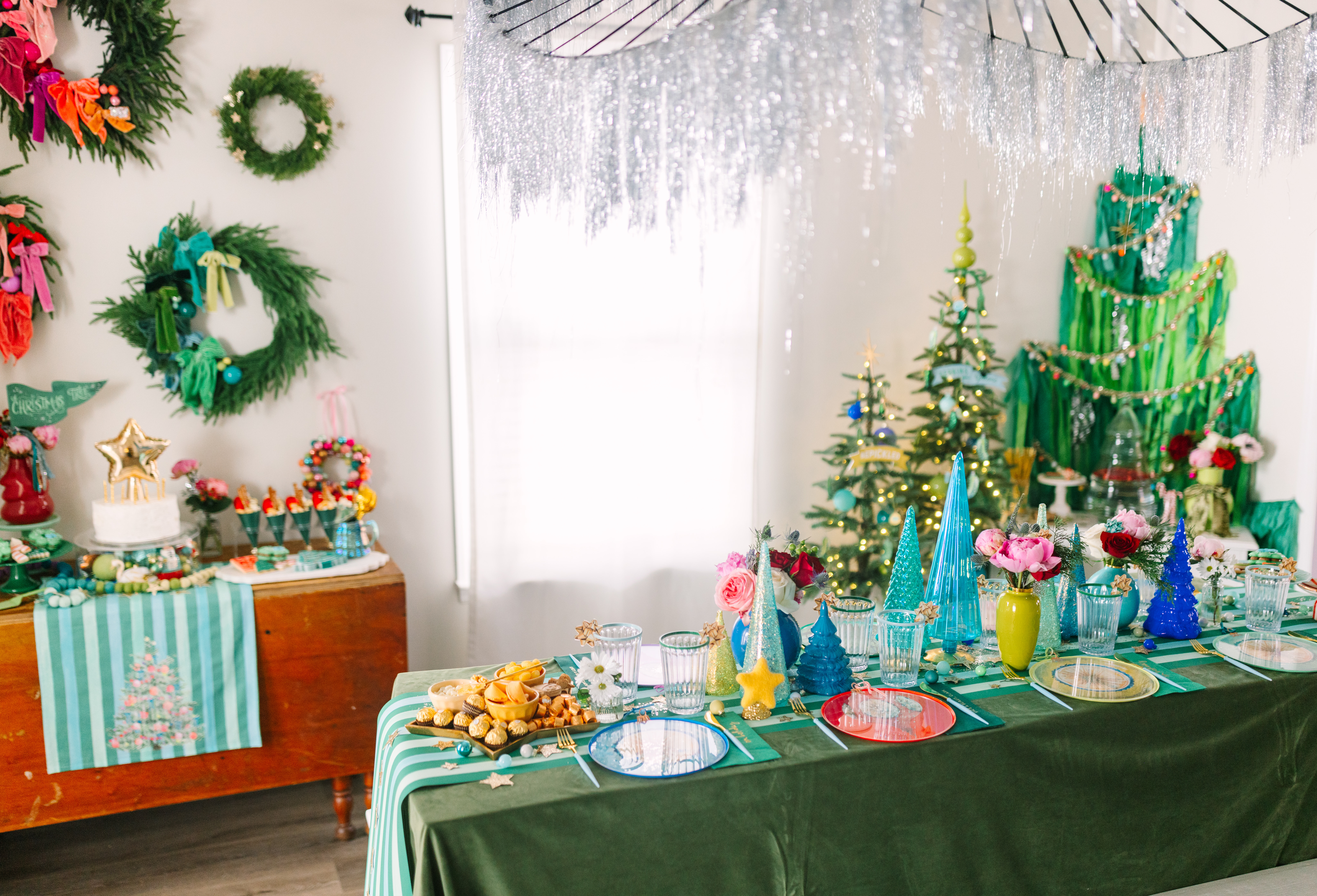 Do you remember the Fringe Tree House Of Fete designed with Glam Fete back in 2020? We used it for our Merry and Bright shoot and it made another appearance. This time I hung it in the corner to giver it a different looks. I kept it simple with a tinsel ornament garland and added my little white bar in front. I filled the bottom with velvet presents each tied with a bow and finished with a Chalk Designs By Me tag. the bar had a gorgeous tree drink dispenser, a few plates of cookies and a floral arrangement.