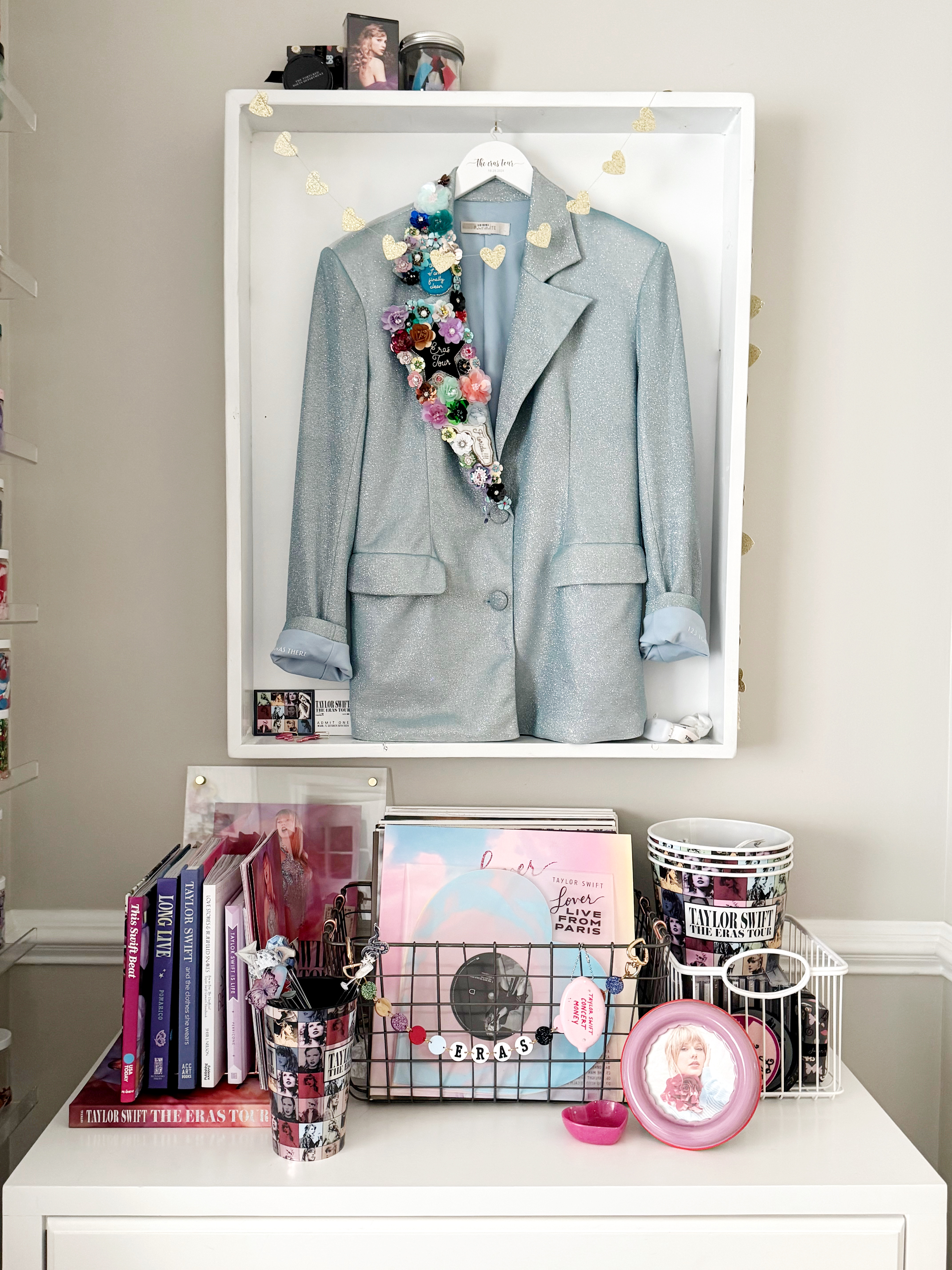 Based on this frame, I converted an entire corner of my office into all things Taylor. I moved over all my vinyls, CDs, and books. I added my bracelets, Eras Movie items and everything in-between. We put the finishing touches on it last weekend and I am so in love with how it turned out!